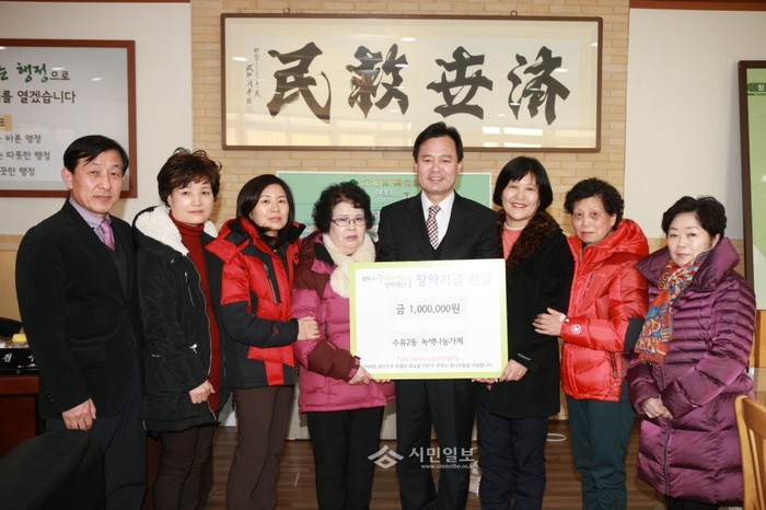 서울 강북구 수유2동 녹색나눔가게는 지난 한 해 동안 수유2동 주민센터, 토요벼룩시장, 수유교보바자회 등에서 판매한 물품 수익금을 최근 강북구꿈나무키움장학재단에 장학금으로 기탁했다. 사진은 박겸수 구청장(오른쪽 네번째)과 관계자들이 장학금 전달식에서 기념촬영을 하고 있는 모습. (사진제공=강북구청)