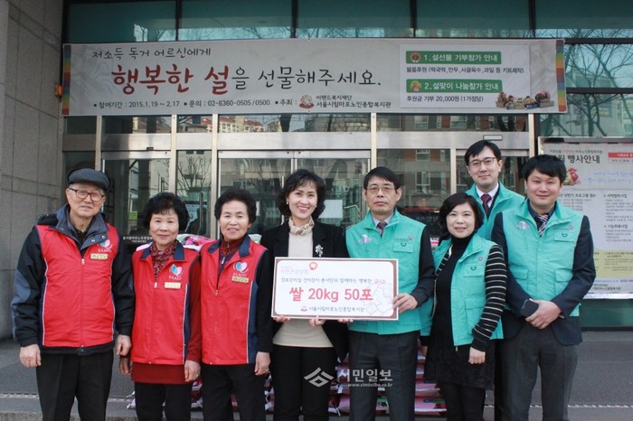 30일 서울시립마포노인종합복지관은 국민건강보험공단 정보관리실로부터 쌀 20kg 50포대를 기부받는 '행복한 설맞이 아름다운 쌀나눔 전달식'을 복지관 1층 현관 앞에서 열었다. 사진은 이날 전달식에 참석한 성미선 관장(왼쪽 네번째)과 행사 관계자들의 모습. (사진제공=서울시립마포노인종합복지관)