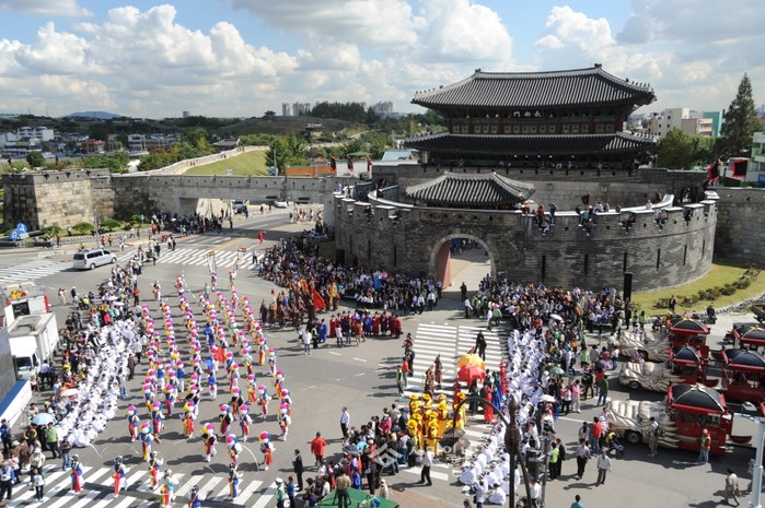 | ▲ 수원화성 인근에서 열린 '화성 문화제 퍼레이드'가 진행 중인 모습.(사진제공=수원시청) | ||