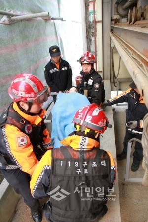 서울 구로소방서가 2일 오후 1시쯤 개봉동에 위치한 한 건축현장 5층에서 추락한 인부 곽 모씨(49)를 구조해 고려대학교 구로병원으로 이송조치했다. 곽씨는 후두부 부종 등의 부상을 한 것으로 알려졌다. 사진은 구조작업 중인 소방대원들의 모습.(사진제공=구로소방서)