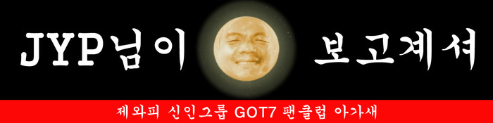갓세븐 팬클럽 아가새(I GOT7)가 공개한 현수막은 "JYP님이 보고계셔"라는 평범한 문구 사이에 임팩트 있는 존재가 환하게 웃고 있다.