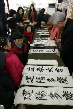 지난 4일 성동구 마장동 주민자치회가 운영하는 '마주보고 카페'에서 입춘을 맞아 주민들에게 '입춘대길, 건양다경'의 문구가 담긴 입춘첩을 전달했다. 입춘첩은 마장동 주민자치회관 서예 수강생의 재능기부로 만들어졌다. 사진은 재능기부를 한 서예 수강생이 입춘첩 문구를 쓰고 있는 모습. (사진제공=성동구청)