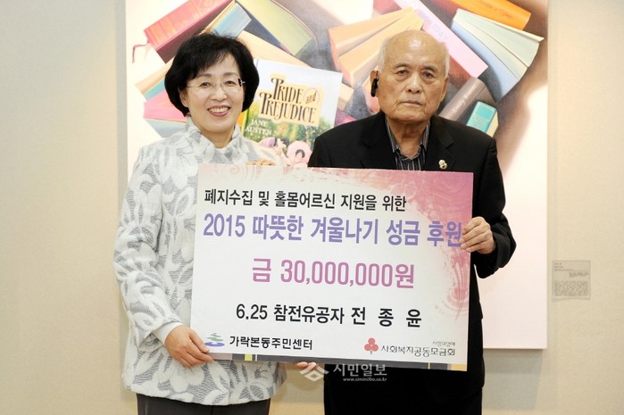 최근 서울 송파구청에서 열린 ‘2015 따뜻한 겨울나기 성금 후원식'에서 전종윤씨(오른쪽)가 박춘희 구청장(왼쪽)에게 가락본동에 거주하는 폐지 수집 노인 및 저소득 홀몸노인에게 전달해달라며 3000만원을 기탁하고 있다.(사진제공=송파구청)