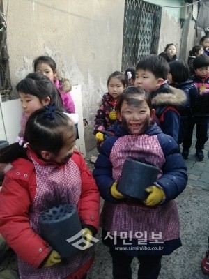 지난 4일 인천 남구 학익2동 소속 환경미화원들과 개나리어린이집 원생들이 '설맞이 사랑의 연탄 나눔 행사'를 진행했다. 연탄은 개나리어린이집의 한 원생 부모가 기증해 마련됐으며, 지역내 홀몸노인 2가구에 200장씩 전달됐다. 사진은 개나리어린이집 원생들이 연탄을 나르고 있는 모습. (사진제공=남구청)