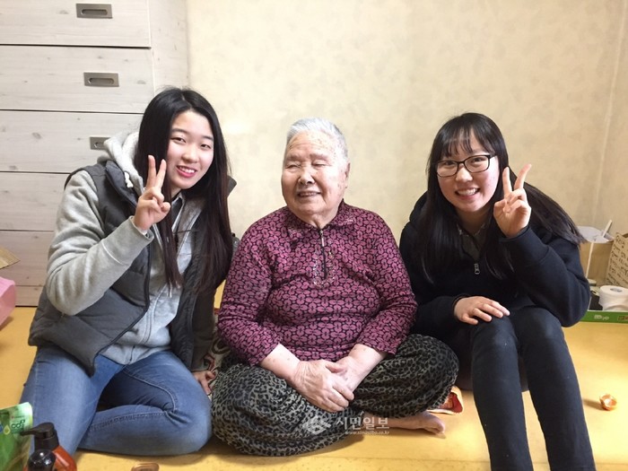 경기 부천 부흥중학교가 지난 4일 '이웃 사랑 실천의 날'을 진행했다. 이날 부흥중 학생회 학생들과 교사들은 지역 홀몸노인 12명의 집을 방문해 효도안마하기·말벗되기 등의 이웃 사랑을 실천했다. 또 노인들에게 부흥중 축제를 통해 모은 수익금으로 구입한 생활용품을 전달했다. 사진은 홀몸노인의 집을 방문한 부흥중 학생들이 함께 기념촬영한 모습. (사진제공=부천교육지원청)
