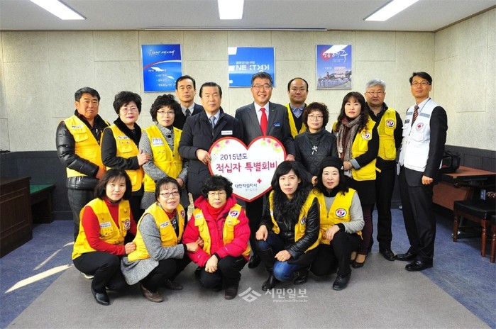 지난 4일 원경희 경기 여주시장이 시청 상황실에서 김훈동 대한적십자사 경기지사 회장을 만나 2015년도 적십자 특별회비를 전달했다. 김 회장은 원 시장과 여주시에 감사를 표하고 적십자 특별회원증을 전달했다. 사진은 특별회비 전달식에 참여한 원 시장(뒷줄 오른쪽에서 여섯번째)과 관계자들의 모습.(사진제공=여주시청)