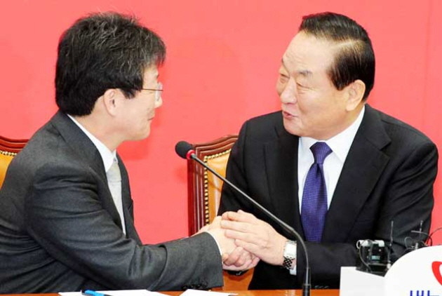 5일 오전 서울 여의도 국회 새누리당 대표실에서 열린 최고위원회의에서 서청원 최고위원이 발언에 앞서 유승민 원내대표의 손을 잡고 웃으며 이야기하고 있다.