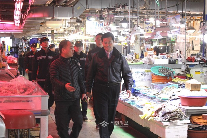 인천 강화소방서는 6일 다가오는 설 명절을 대비해 시민이 안전하고 편안한 명절을 보낼 수 있도록 강화풍물시장에 대한 '관서장 현장예찰활동'을 실시했다. 사진은 류환형 강화소방서장과 관계자들이 시장을 순찰하고 있는 모습. (사진제공=강화소방서)