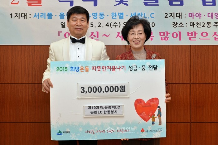 최근 서울 송파구 마천2동 주민센터에서 실시한 ‘나누며 함께하는 이웃사랑 실천행사’에 참가한 박춘희 구청장이 김선봉 국제라이온스협회 354-D지구 제10지역 대표로부터 독거노인들과 소년소녀가정에게 전해질 300만원 상당의 성금 및 기념품을 전달받고 있다.(사진제공=송파구청)