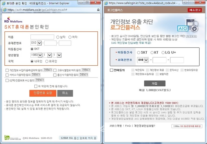 | ▲ 왼쪽은 휴대폰 본인인증창. 오른쪽은 취재 후 디자인이 변경된 '로그인플러스' 회원가입창의 모습.(사진제공=KG모빌리언스, 로그인플러스 화면 갈무리) | ||