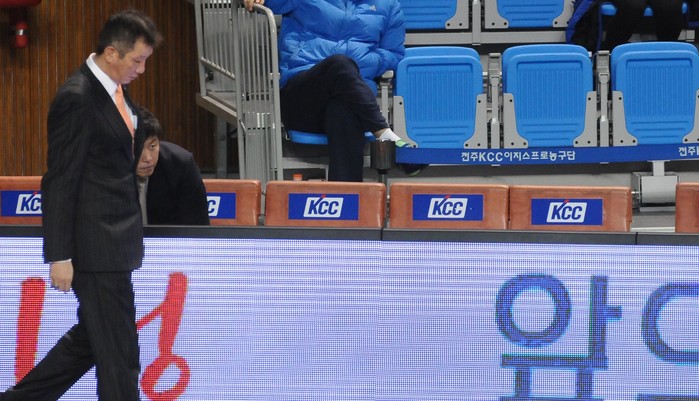 | ▲ 지난달 30일 전북 전주실내체육관에서 열린 2014-2015 KCC프로농구 전주KCC와 원주동부 프로미와의 경기에서 KCC의 허재 감독이 동부에 84대 66으로 패배한 뒤 고개를 숙인 채 코트를 걸어나가고 있다. /뉴시스 | ||