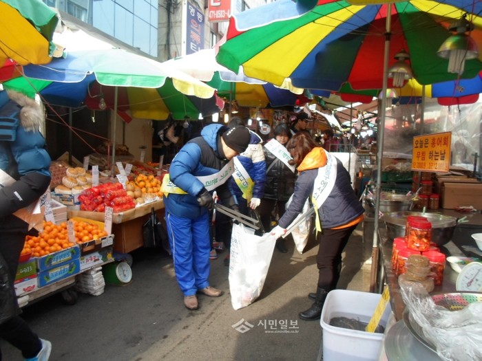 최근 인천 남동구 만수2동의 만수시장에서 만수시장진흥조합회, 동 자원봉사센터, 청소년 봉사자 등 40여명이 설을 맞아 만수시장 주변 2km 구간에서 '설맞이 전통시장 대청소'를 실시했다. 사진은 청소 중인 봉사자들의 모습. (사진제공=남동구청)