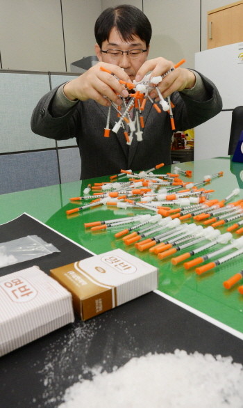 대전지방경찰청 마약수사대는 10일 오전 인터넷 게시판에 마약류(필로폰, 물뽕), 청산가리 등의 판매 글을 올린 후 구매 의사를 밝히며 돈을 입금한 사람들에게 필로폰 대신 가짜 마약인 황산알루미늄칼륨(일명 백반)을 보내주는 방법으로 54회 걸쳐 2500여만원을 편취한 가짜 마약판매책 2명 등 총 15명을 검거 브리핑을 갖고 마약수사대 형사들이 범행에 사용된 가짜마약과 주사기를 보여주고 있다.