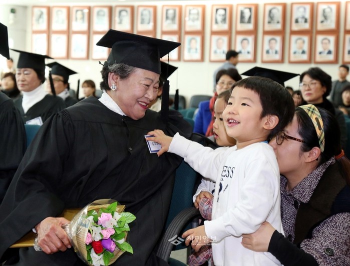 12일 경기 용인시청 철쭉실에서 학교를 제대로 다니지 못한 성인들을 대상으로 하는 초등학력 인정 문자해독 교육 프로그램인 '용인시 성인문해학교'의 졸업식이 진행됐다. 사진은 이날 졸업식에 참석한 한 졸업생과 가족들이 함께 축하하고 있는 모습. (사진제공=용인시청)