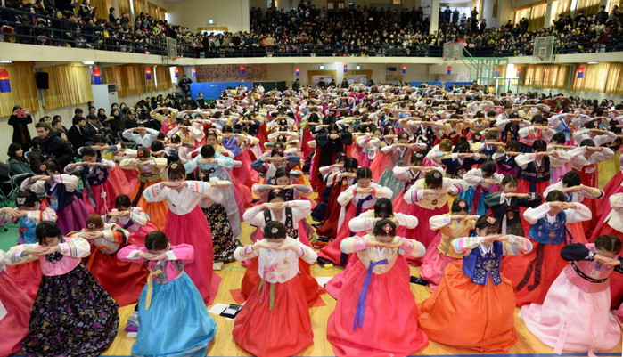 12일 오전 서울 은평구 동명여자고등학교에서 열린 제92회 졸업식 및 성년례(成年禮)에서 한복을 곱게 차려입은 졸업생들이 큰절을 올리고 있다.