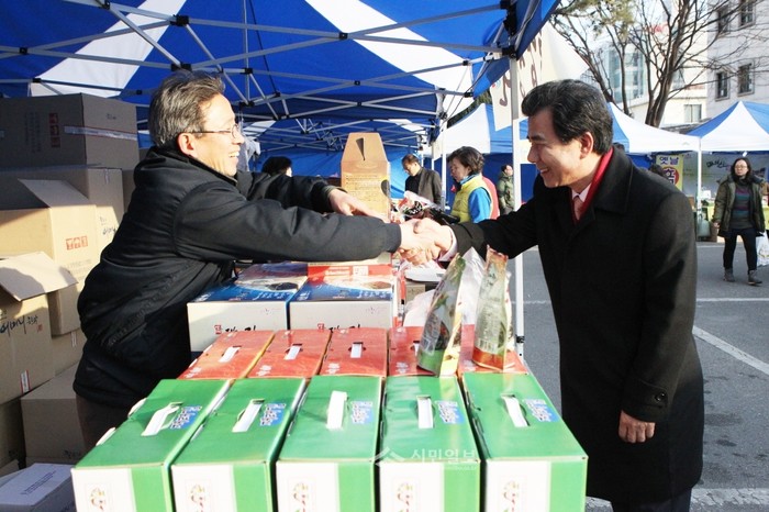지난 11일 서울 강동구청 앞 광장에서 강동구와 자매결연을 한 14개 지방자치단체에서 생산한 농산물을 생산자가 직접 소비자들에게 판매하는 '설맞이 직거래 장터'가 열렸다. 사진은 이날 장터를 방문해 판매자와 인사를 나누는 성임제 서울 강동구의회 의장(오른쪽)의 모습. (사진제공=강동구의회)