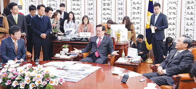 이완구 국무총리 후보자의 임명동의안 처리를 두고 12일 오전 서울 여의도 국회에서 여야 원내대표와 원내수석부대표가 정의화 국회의장을 만나 이야기를 나누고 있다. 왼쪽부터 유승민 새누리당 원내대표, 정의화 국회의장, 우윤근 새정치민주연합 원내대표.