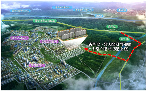 ‘충주 코아루 퍼스트’는 지하1층~지상15층, 8개동 규모로 전용면적 59㎡, 603가구 규모로 이루어져 있다. 중부내륙고속도로 충주IC와 2km 거리에 위치하며 중부내륙고속도로를 이용하면 서울과 수도권이 1시간대에 연결된다. 단지 옆 첨단산업로와 3번 국도를 통해 도심의 접근성도 좋다.