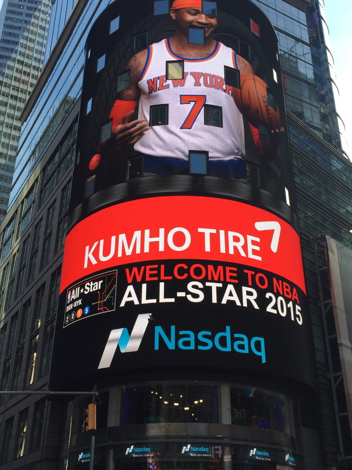 | ▲ NBA 올스타를 테마로 한 금호타이어의 광고가 뉴욕 중심주의 한 전광판에서 나오고 있다.(사진제공=금호타이어) | ||