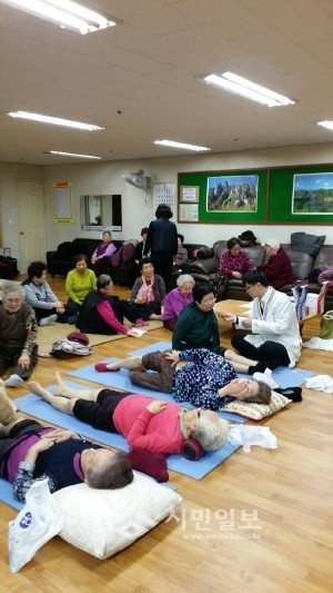 서울 성동구가 최근 의료취약계층·거동이 불편한 노인을 대상으로 찾아가는 의료서비스를 실시하고 있다. 이 서비스는 한방진료단이 매월 넷째주 목요일 경로당을 찾아 혈압·혈당점검과 침·뜸·부항·한방약품 등의 의료서비스를 제공하고 건강상담·중풍예방교육 등을 진행한다. 사진은 경로당 노인들이 한방진료단에게 침 치료를 받고 있는 모습.(사진제공=성동구청)