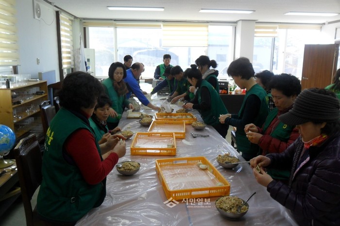 12일 경기 포천시 이동면의 남·녀 새마을지도자회가 지역내 홀몸노인들의 명절나기를 돕기 위한 '사랑의 만두 만들기' 행사를 실시했다. 지도자회 회원 30여명이 참여한 이날 행사에서 만든 만두는 지역내 80여명의 홀몸노인들에게 전달됐다. 사진은 참여자들이 만두를 만드는 모습. (사진제공=포천시청)