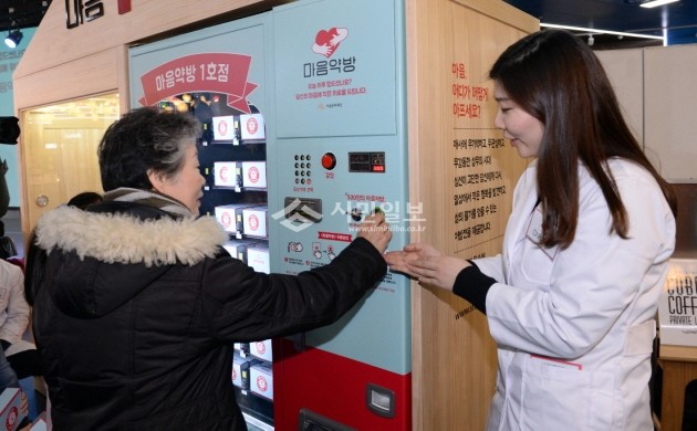 13일 오후 서울시청 시민청 활짝라운지에서 시민들이 서울문화재단 주관으로 설치된 '마음약방' 자판기를 이용하고 있다. 마음약방은 현대인의 20가지 우울증상에 대해 그림, 영화, 시 등 예술작품 추천과 테마지도, 비타민제 등 소소한 재미와 스토리가 있는 물품을 처방하는 자판기다.