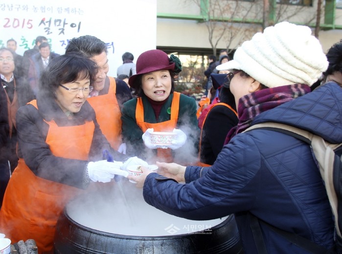 최근 서울 강남구청 주차장에서 양질의 차례용품을 저렴하게 구입할 수 있는 ‘2015년 설맞이 강남구 직거래 장터’를 방문한 신연희 강남구청장(오른쪽)이 구민들에게 비빔밥을 만들어 제공하고 있다.(사진제공=강남구청)