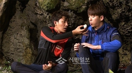 | ▲ 정글의 법칙 With 프렌즈편에서 배우 손호준과 바로가 계란을 나눠 먹고 있다. (사진출처=SBS) | ||
