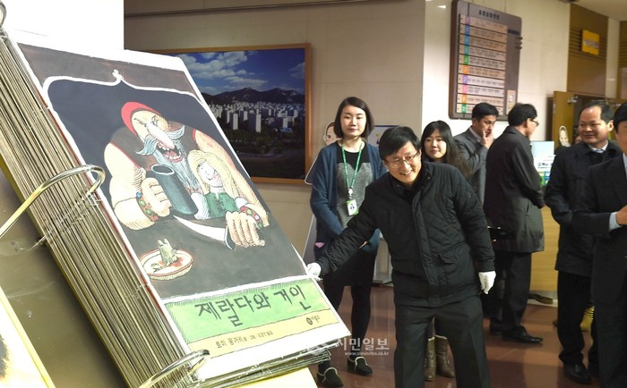 | ▲ 노원구는 지난 5일 '책 읽는 노원 선포식'을 개최하며 '노원 한 책 읽기 운동'을 시작했다. 사진은 이날 '명사와 함께하는 큰 책 읽기' 행사에 참석한 김성환 노원구청장이 큰 책으로 만든 <제랄다와 거인>의 책장을 넘기고 있는 모습. (사진제공=노원구청) | ||