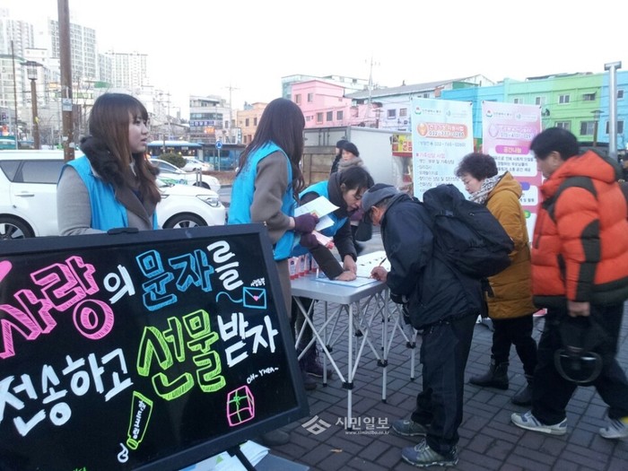 최근 인천 동구 여성회관 건강가정지원센터가 동인천역 북광장에서 인근 주민들을 대상으로 매우 가까워 오히려 평소에 사랑한다는 말을 하기 어려웠던 가족에게 따뜻한 말 한마디를 문자로 보내는 '사랑의 문자보내기' 등을 홍보하는 가족사랑 캠페인을 실시했다. 사진은 캠페인이 진행 중인 모습. (사진제공=동구청)
