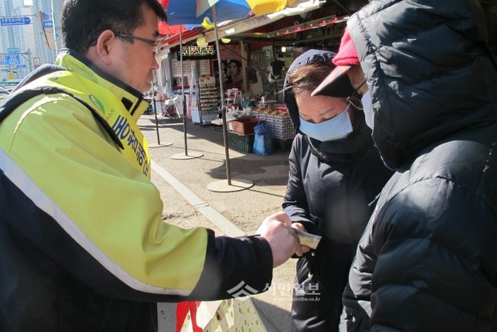경기 군포소방서가 설 명절을 맞아 많은 주민이 쇼핑을 하기 위해 방문하는 산본·군포시장을 방문해 군포시와 합동으로 화재예방을 위해 비상구·소화시설 등의 관리상태를 확인하고 애로사항을 듣는 '화재예방 합동캠페인 및 점검'을 실시했다. 사진은 화재예방 홍보물을 배부 중인 모습.(사진제공=군포소방서)