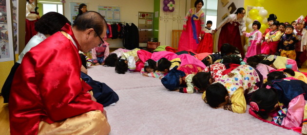 설명절을 사흘 앞둔 16일 서울 성동구 용답어린이집에서 한복을 입은 어린이들이 어르신들에게 세배를 올리고 있다.