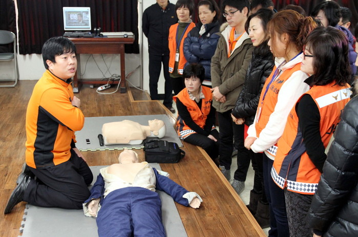 서울 송파소방서 소방대원이 23일 송파구 본서 강당에서 의용소방대원들을 대상으로 심폐소생술 교육을 하고 있다.