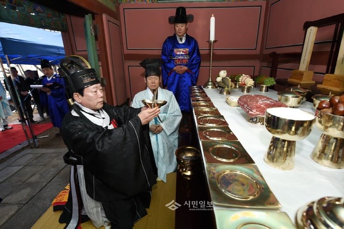 지난 21일 경기 광주시 초월읍 대쌍령리에 위치한 정충묘에서 병자호란에 희생된 조상들의 넋을 기리기 위해 광주시와 광주문화원이 '정충묘 제향'을 진행했다. 이날 제향에서는 조억동 시장이 초헌관을, 노철래 국회의원이 아헌관을, 박기준 문화원장이 종헌관을 맡았다. 사진은 제향에 참여한 조억동 시장의 모습.(사진제공=광주시청)