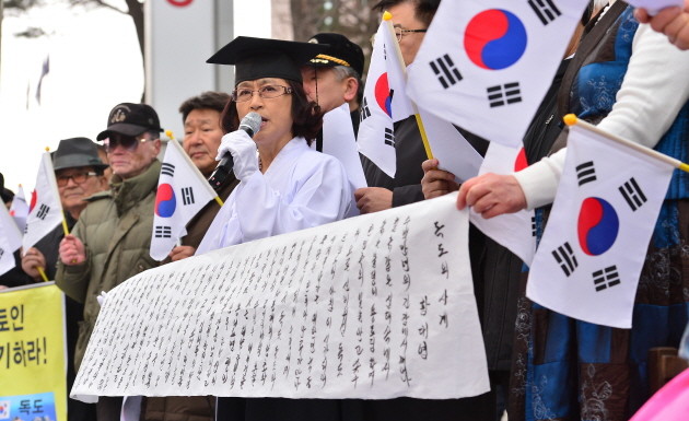 23일 오전 서울 종로구 주한일본대사관 앞에서 독도사랑국민연합을 비롯한 시민단체 회원들이 일본 다케시마의 날 규탄 기자회견을 하고 있다.