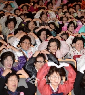 24일 오전 서울 마포구 마포아트센터에서 열린 '양원주부학교 졸업장 수여식'에서 졸업생들이 사랑의 하트를 그려 보이고 있다.