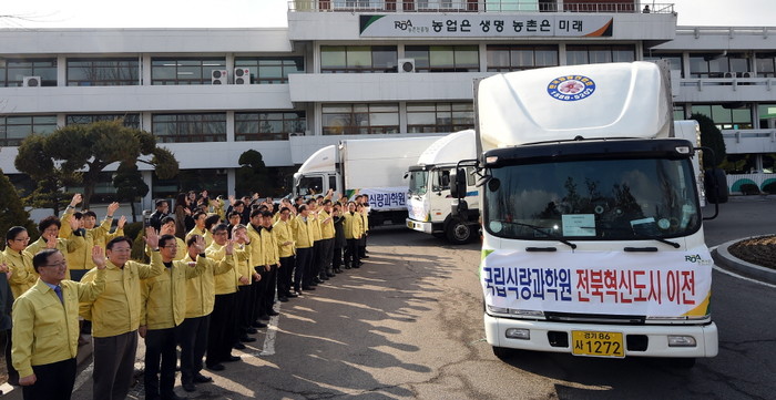 24일 오전 경기 수원 농촌진흥청 국립식량과학원에서 임상종 원장과 직원들이 각종 연구물품과 기자재를 싣고 전북혁신도시 농업생명연구단지로 향하는 차량을 향해 손을 흔들고 있다. 지난해 9월 농촌진흥청 본청과 국립농업과학원은 전북혁신도시로 이전했고 이날부터 국립식량과학원을 시작으로 나머지 산하기관인 국립원예특작과학원, 국립축산과학원 등도 이전을 마무리 할 예정이다.