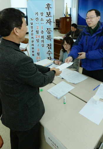 는 3월 11일 시행되는 제1회 전국동시조합장선거 후보자 등록 첫날인 24일 오전 대구 달성군 화원읍 달성군선거관리위원회에서 한 후보자가 등록 접수증을 받고 있다. 농협·수협·산림조합 등 조합장선거가 전국 동시에 치러지는 것은 이번이 처음으로 부정선거를 막고 선거 효율성을 높이기 위해 공직 선거처럼 선관위가 일괄 관리한다.