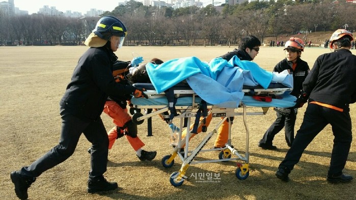 지난 24일 경기 화성 아스콘공장에서 가스절단기 작업중 발생한 화재로 전신화상을 입고 헬기로 이송된 최 모씨(37)를 서울 동작소방서 대원들이 신속하게 구급차로 이송하고 있다. (사진제공=동작소방서)