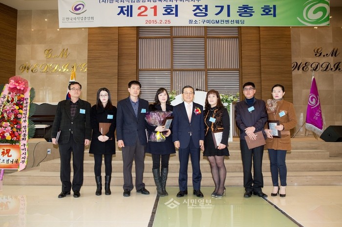 경북 구미시 외식업구미시지부는 25일 오전 11시 GM컨벤션웨딩에서 구미시장, 시의원, 외식업지부 대의원 등 250여명이 참석한 가운데 2015년 정기총회를 개최했다. 사진은 식품위생 유공자에 대한 표창 수여가 끝난 후 남유진 구미시장(왼쪽 네번째)과 수상자들이 기념촬영을 하고 있는 모습. (사진제공=구미시청)