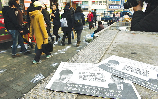 박근혜 대통령 취임 2주년인 25일 오후 서울 마포구 지하철2호선 신촌역 인근에서 ‘민주주의를 염원하는 시민들’이라는 명의의 단체가 살포한 박근혜 대통령 규탄하는 전단지가 바닥에 떨어져 있다.