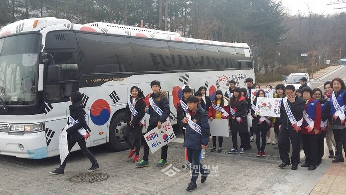 지난 25일 경기도 구리시가 실시한 ‘태극기 달기 홍보 캠페인’에 참여한 지역 초·중학생 20여명이 직접 만든 태극기 홍보 피켓을 들고 시민들의 왕래가 많은 곳에서 캠페인을 펼치기 위해 태극기 홍보버스로 이동하고 있다. (사진제공=구리시청)