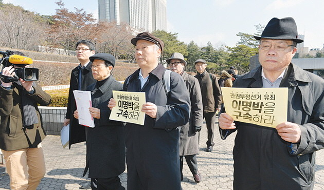 한국진보연대 및 민변을 비롯한 시민단체 관계자들이 국정원 대선부정선거와 관련한 이명박 전 대통령 고발장을 접수하기 위해 26일 오전 서울 서초구 서초동 서울중앙지검으로 들어서고 있다.