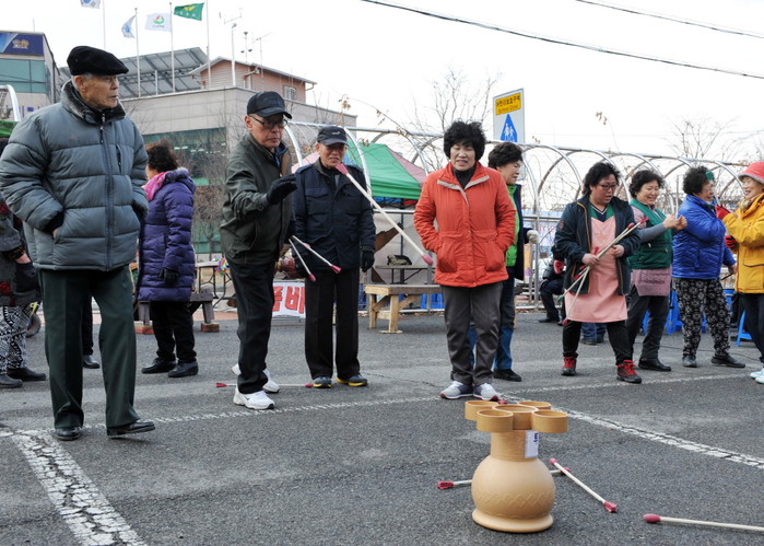 최근 경기 동두천시 송내동 주민센터에서는 동 주민센터 1층에서 송내동체육회 주최로 정월대보름을 앞두고 민속놀이 행사를 개최했다. 이날 민속놀이행사에는 윷놀이, 제기차기, 투호 3종목을 시합하며 민족고유의 세시풍속을 체험하는 자리로 꾸며졌다. 사진은 참가한 주민들이 투호놀이를 하는 모습. (사진제공=동두천시청)