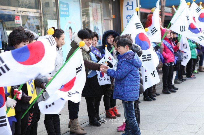 서울 강북구가 지난 2월26일 오후 2시 강북구청 사거리 및 수유역 일대에서 지역주민 300여명과 함께 ‘3.1절 나라사랑 전 가정 태극기 달기 운동’을 펼쳤다. 사진은 캠페인에 참여한 강북구 새마을지회, 한국자유총연맹 강북구지회, 바르게살기운동 강북구협의회 회원들이 주민에게 태극기를 배부하고 있는 모습. (사진제공=강북구청)
