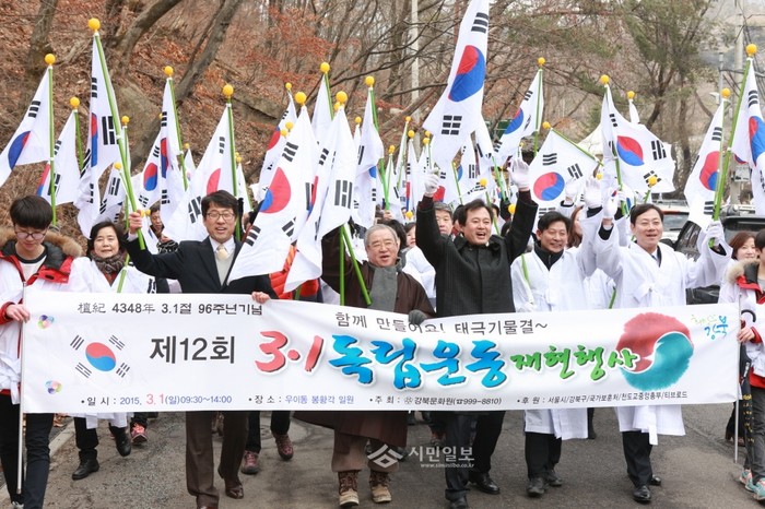서울 강북구가 제96주년 3.1절을 맞아 지난 1일 우이동 봉황각 일원에서 '봉황각 3.1독립운동 재현행사'를 개최했다. 사진은 '대한독립만세'를 외치며 태극기 거리행진을 하는 박겸수 강북구청장(오른쪽에서 세번째)과 강북구민들의 모습. (사진제공=강북구청)
