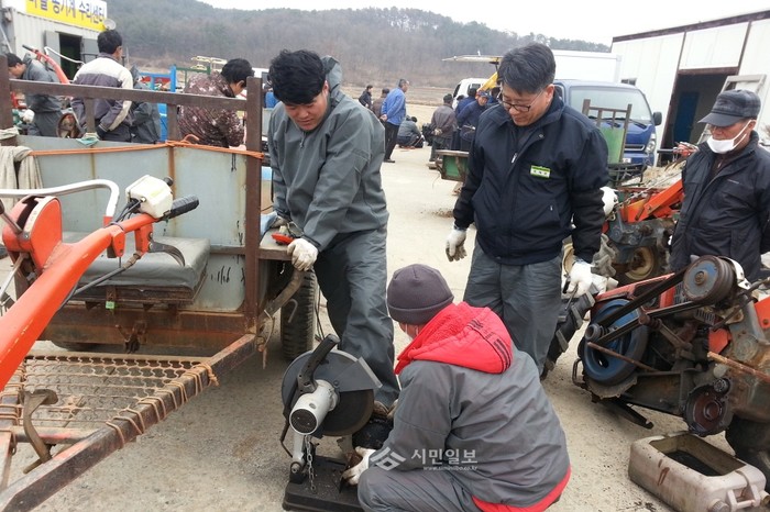강화군이 2일 농기계정비기술연구회와 합동으로 서도면 주민들을 대상으로 농기계순회수리 봉사활동을 펼쳤다. 이날 농기계정비기술연구회 소속 전문 수리기사들은 농기계수리점이 없어 불편을 겪는 서도면 주민들을 위해 농기계 수리 봉사를 진행했다. 사진은 기계순회수리 봉사에서 수리기사들이 농기계를 수리 중인 모습. (사진제공=강화군청)