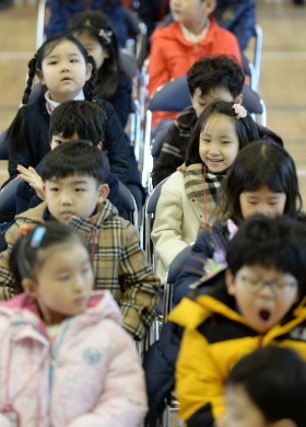 2일 오전 서울 동작구 흑석초등학교에서 열린 입학식에서 1학년 신입생들이 학교장의 환영사를 듣고 있다.