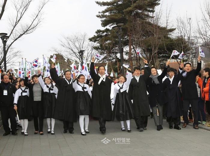 서울 서대문구의회 류상호 의장(왼쪽 다섯번째)은 지난 1일 서대문형무소역사관에서 열린 '제96주년 3.1절 기념행사'에 참석해 역사관부터 독립문까지 태극기를 들고 만세를 외치며 걷는 '3.1 독립만세행진'을 주민들과 함께 했다. (사진제공=서대문구의회)