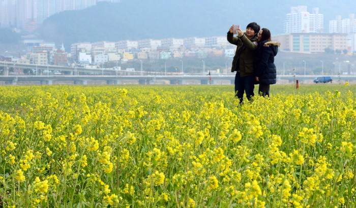 지난 1일 오전 부산 강서구 대저생태공원 일부에 유채꽃이 활짝 펴 시민들의 발길을 붙잡고 있다.